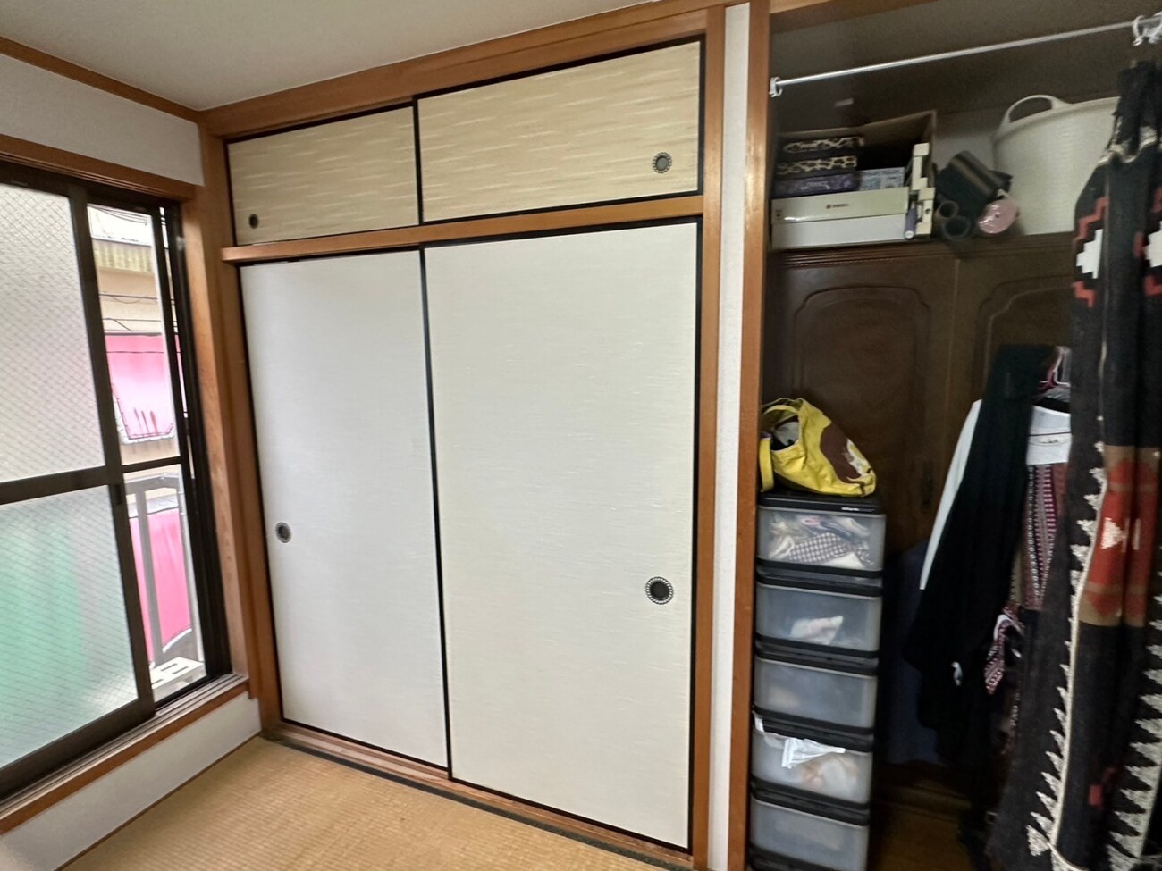 そのため、奥行きが80~90cmと深く、布団を収納するには十分ですが、収納力がひまひとつです。多くの押入れは中央で上下に仕切られているため、洋服をかけての収納が難しいのも使いづらい….