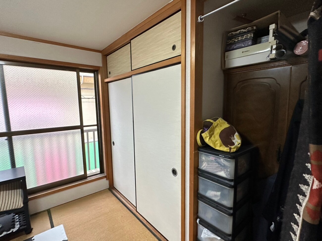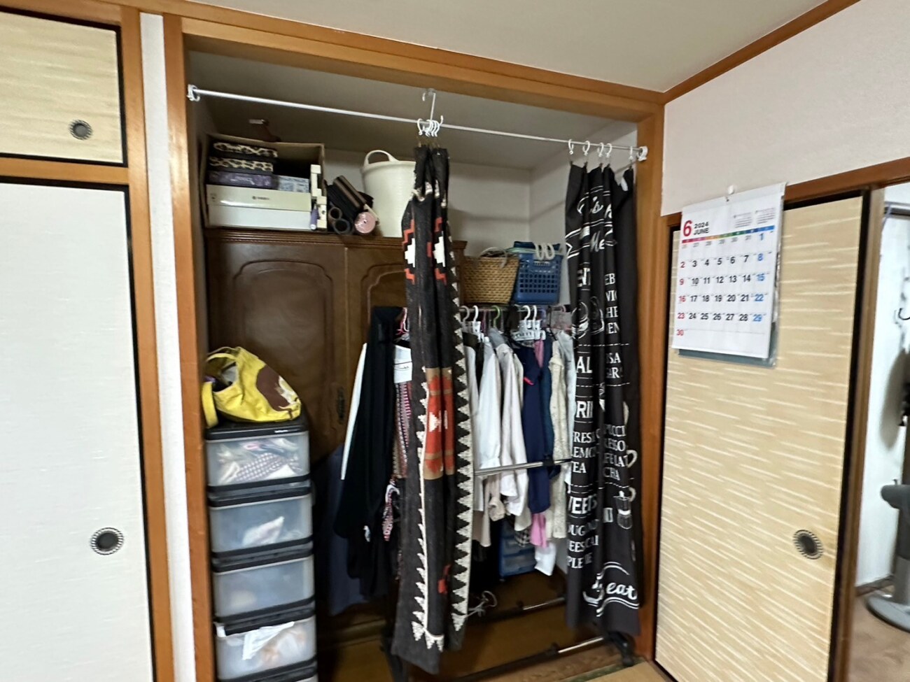 そのため、奥行きが80~90cmと深く、布団を収納するには十分ですが、収納力がひまひとつです。多くの押入れは中央で上下に仕切られているため、洋服をかけての収納が難しいのも使いづらい….