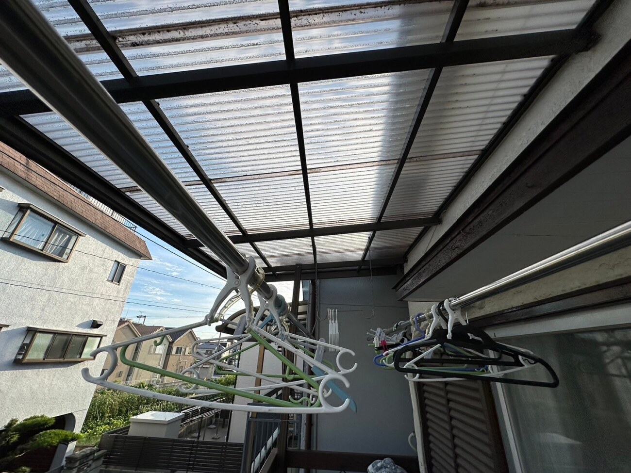 2階のベランダ屋根の波板が浮いてしまっていました。